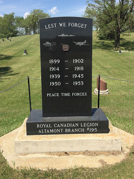 A monument in the Altamont Cemetery near Altamont, in the Municipality of Lorne, was erected by the Altamont branch of the Royal Canadian Legion in commemoration of those from the local area killed during military service.