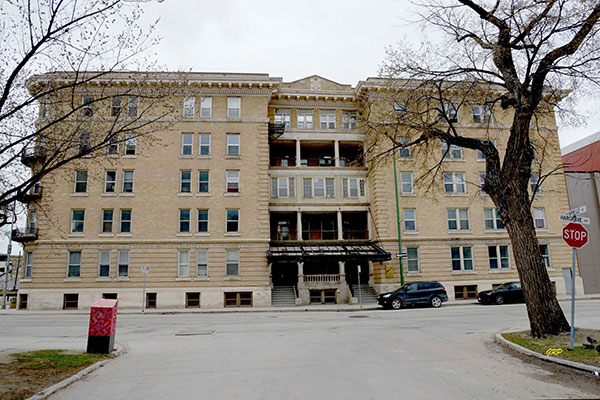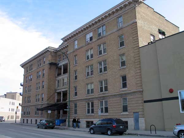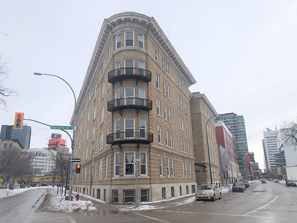 This wedge-shaped five-storey building at the corner of Hargrave Street and Cumberland Avenue was designed by local architect John Woodman and constructed in 1909 by the construction firm of John McQuarrie and George McLeod. Known originally as the Breadalbane Block, its owners were James Fisher (who named it after his Scottish birthplace) and John D. McArthur. The original design provided 12 bachelor, one- and two-bedroom suites on each floor, with a janitor’s suite in the basement. Larger units had a drawing room, dining room, kitchen, and bathroom. Plans initially included a fifth-floor restaurant with a smoking room over the central balcony and small suites along Cumberland. Most of this space was converted to suites when the restaurant was not installed, but the smoking lounge was retained.