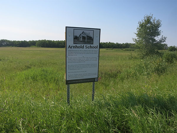 The Arnhold School District was established formally in April 1912, although it operated informally in the home of a local resident, and a one-room schoolhouse was bult in 1913 at SE30-15-6E in the Rural Municipality of St. Clements on two acres of land donated by Casper and Anna Ogonowski. In 1947, the school closed due to low enrollment and the district was dissolved in 1967. Its area became part of the Lord Selkirk School Division. In 2018, a commemorative sign was installed about 0.5 kilometres east of the former school site.