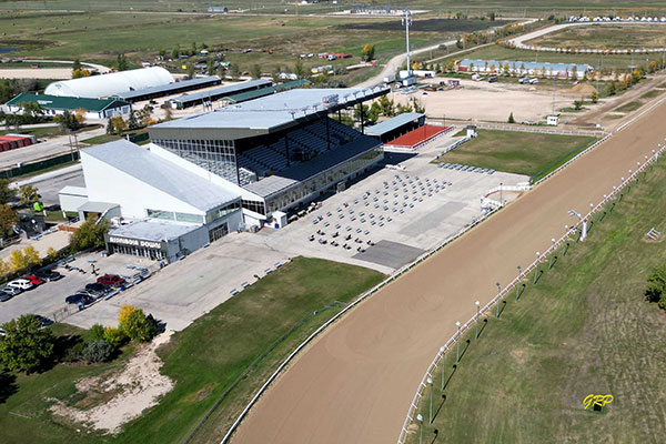 Aerial view of the Assiniboia Downs grandstand (September 2023)