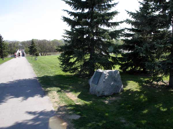 This plaque at the Portage Avenue entrance to Assiniboine Park in Winnipeg, north of the pedestrian bridge over the Assiniboine River, commemorates the founding of the park. On 16 May 1904, the Winnipeg City Coucil acted on advice from the Winnipeg Public Parks Board by purchasing a large tract of land to establish the park. The plaque was unveiled by Mayor Bill Norrie in July 1981.