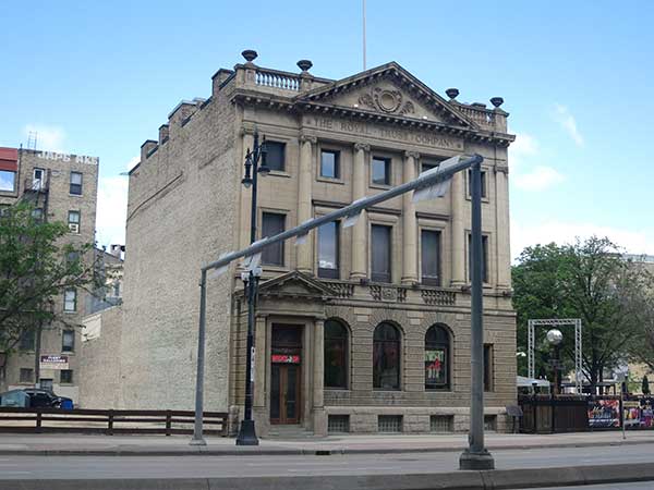 This three-storey structure on Main Street is the only surviving pre-1914 building between Portage Avenue and McDermot Avenue. Built in 1903 for the Bank of British North America, it replaced various leased premises that the bank had occupied since arriving at Winnipeg in 1886.