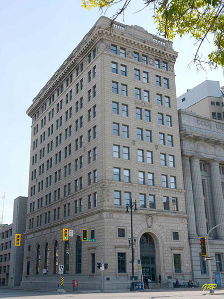 Designed by Winnipeg architect John Danley Atchison and constructed between 1916 and 1918, this building was one of four major banks on “Bankers’ Row” along Main Street. It was the last major office building erected during the city’s early boom period, and served as the Manitoba headquarters of the Bank of Hamilton which merged with the Bank of Commerce in 1923. This plaque is mounted on the northwest corner of the building. Restoration of the building was given a Conservation Award by Heritage Winnipeg and the structure is a municipally-designated historic site.