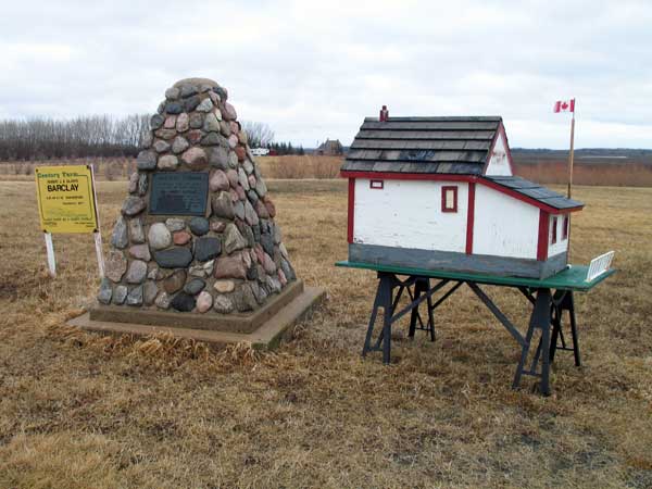 The Barclay School District was established formally in April 1891 and a building was erected on the southwest corner of 34-3-7 west of the Principal Meridian, on an acre of land donated by local farmer Robert Barclay, in what is now the Municipality of Pembina. In 1939, the original stone foundation was replaced by a full basement. The school closed in January 1963 and its catchment area became part of the Darlingford Consolidated School District No. 1228. The school building was destroyed by fire on 3 July 1962. At its site is a commemorative monument, a small model of the school building, and a Century Farm plaque for the family of farmer Robert Barclay, for whom the school was named. A plaque affixed to the monument, unveiled on 5 August 1979, documents the occupancy of the surrounding land by the Barclays.