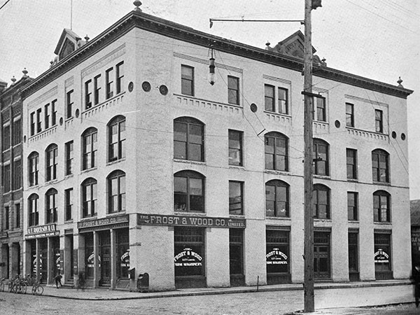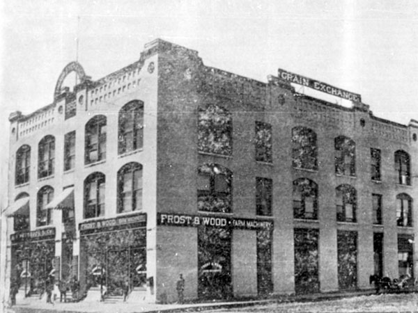 This four-storey brick and stone structure at the southwest corner of Princess Street and Elgin Avenue in Winnipeg, measuring 68 feet by 99 feet, was designed by architect Charles Arnold Barber and erected in 1892 by owner Nicholas Bawlf at a cost of about $30,000. Its original configuration contained two retail spaces on the main floor which were occupied originally by the agricultural implements dealership of Frost & Wood and merchant Henry Shaver Wesbrook. The upper two flors were occupied by the Grain and Produce Exchange and the Winnipeg Board of Trade.