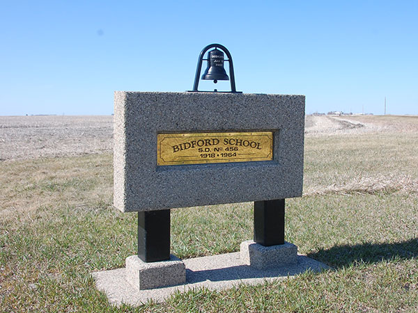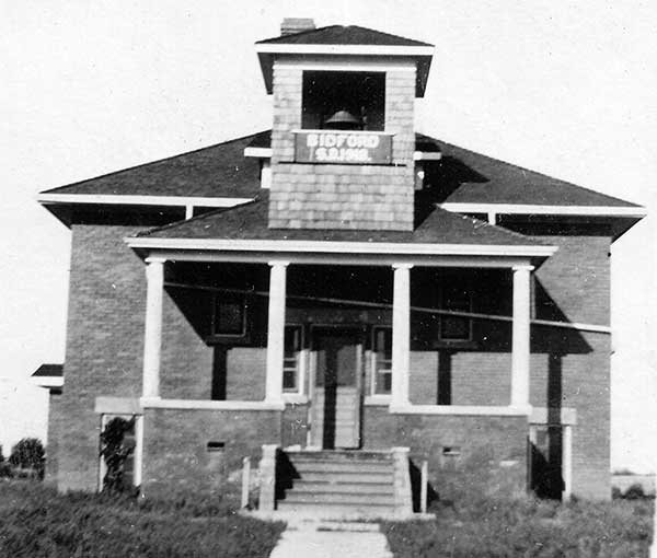The Bidford School District was established in July 1885, named for a town in England from which a local settler had come. A first schoolhouse, a small one-room frame structure, operated at NW16-4-22W in what is now the Municipality of Deloraine-Winchester. In the early 1890s, the school was moved to the northeast corner of SE16-4-22W and it was enlarged in 1901. Seven years later, through the efforts of Education Minister R. S. Thornton, a one-room schoolhouse made of red bricks with a full basement was constructed one-half mile south, on a four-acre grounds in the southeast corner of SE16-4-22W. Between 1922 and 1925, the basement was used for high school classes.