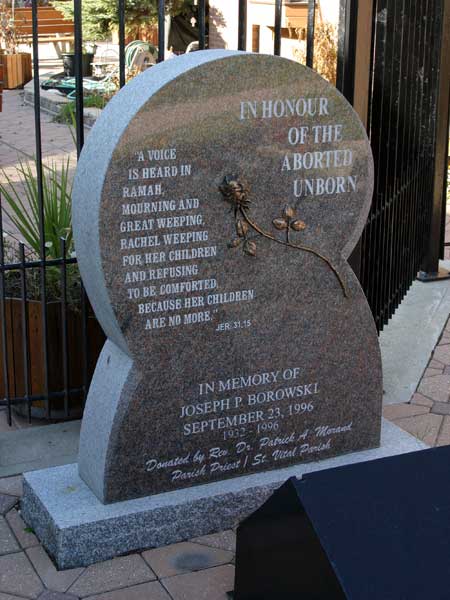This monument, located at the École St. Maurice School/St. Vital Parish Offices at 1629 Pembina Highway, was dedicated on 23 September 1996 to the abortion opponent Joseph P. Borowski.