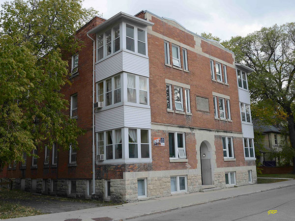 This three-storey brick and stone apartment block on Langside Street in Winnipeg, measuring 48 feet by 89 feet, was designed by architect Peter Cornelius Samwell and built in 1911 by contractor John Edward Wilson. It had 15 suites, three in the basement (along with a laundry), and four on each of the above floors.