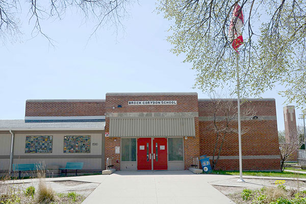 Named for its physical location at the intersection of Brock Street and Corydon Avenue in Winnipeg, this school was designed by architect William Anderson Martin and constructed between 1950 and 1951 by Couture and Toupin at a cost of about $200,000. In its original configuration, the building had seven classrooms and a general purpose room. Opened in February 1951, an official opening occurred on 9 November 1951.