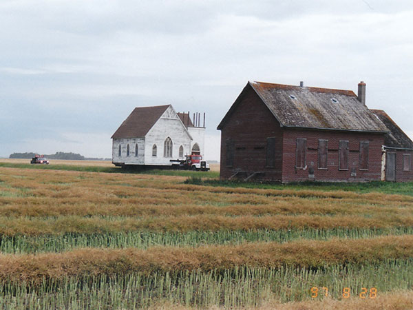The former Bru Frikirkju Lutheran Church being moved past the former Cypress Valley School (August 1997)