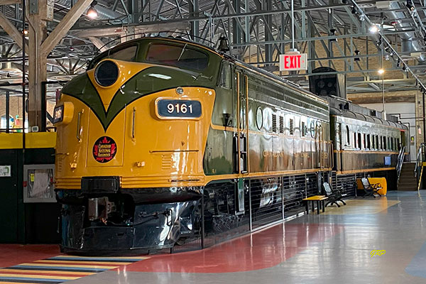 CN locomotive 9161 (built by General Motors in 1952) and 1911 Pullman passenger coach at the Manitoba Children’s Museum (December 2023)