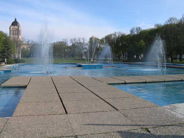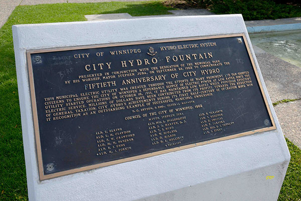 This fountain was presented in conjunction with the dedication of Memorial Park on 28 September 1962 to commemorate the 50th anniversary of Winnipeg Hydro. A nearby commemorative plaque related that: