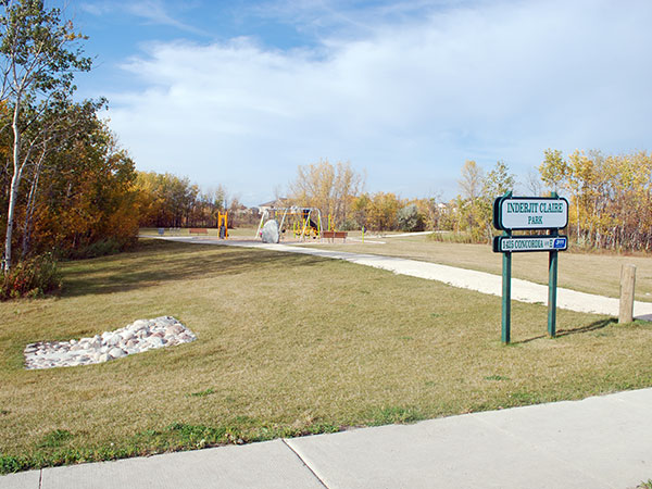 The property, named for area resident Inderjit Singh Claire, was cleared and prepared between 2013 and 2014, with park amenities installed in late 2014. Pathways, landscaping, and other work was undertaken in 2015. Development of the site cost $589,000, funded jointly by the city and provincial governments. An official dedication ceremony was held on 1 October 2016, attended by MP Maryann Mihychuk, MLA Andrew Micklefield, and Councillor Russ Wyatt, when a plaque was unveiled.