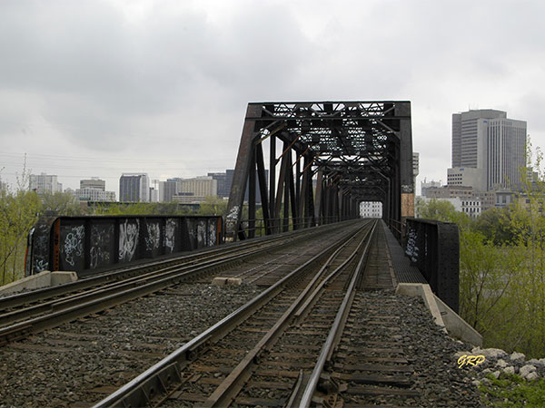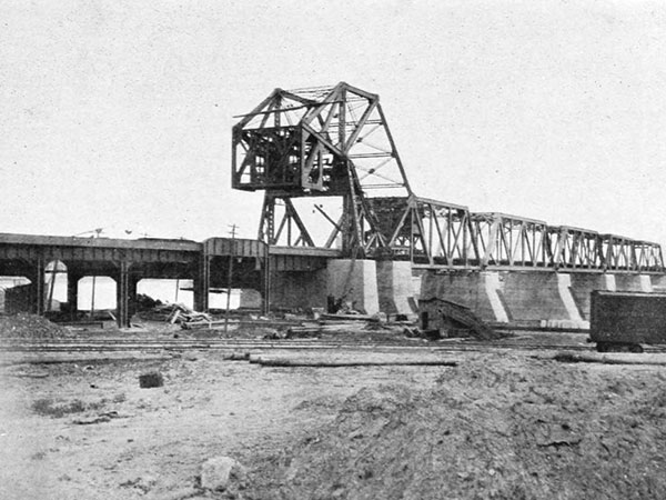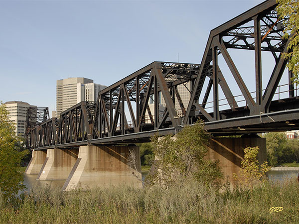 This steel truss bridge over the Red River in Winnipeg, measuring 1180 feet long and 30 feet wide, consisted of four fixed steel spans and one 130-foot Strauss Bascule life span designed to permit passage of ships on the Red River.