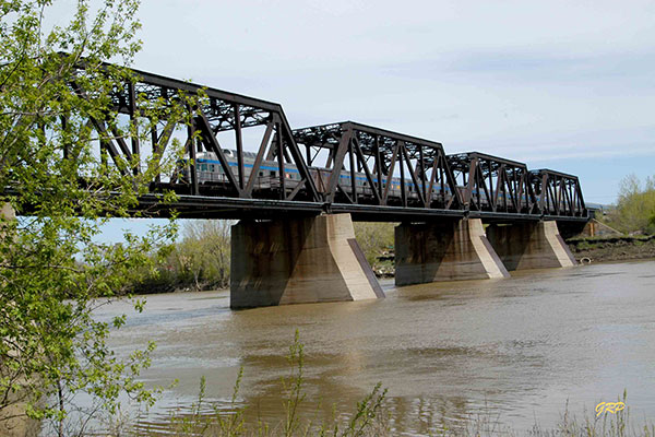 The bridge was constructed between 1910 and 1911, with concrete piers constructed by the firm of Thomas Kelly and Sons and the steel superstructure built by the Dominion Bridge Company at a cost of about $380,000. It was a joint venture between the Grand Trunk Pacific Railway and the Canadian Northern Railway (later the Canadian National Railway).