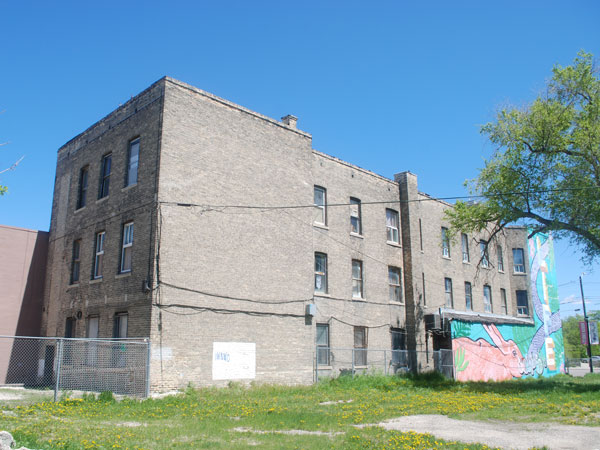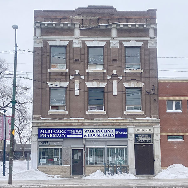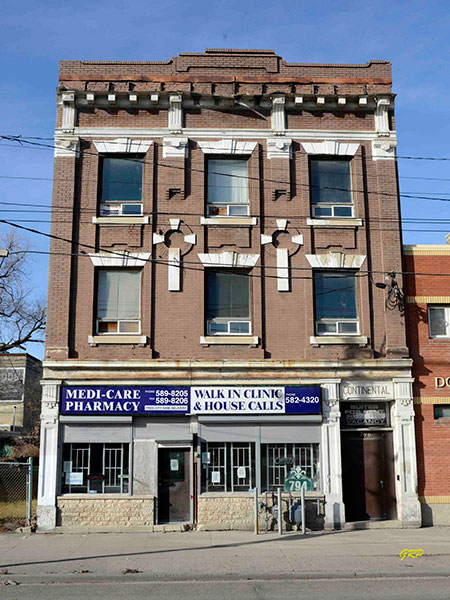 This three-storey brick block on Main Street in Winnipeg was designed by local architect Max Zev Blankstein and built in 1911 by Abraham Cohen for owner Herman Shapera at a cost of about $40,000. In its original configuration, the 33 foot by 130 foot structure had two retail shops on its main floor and twelve residential apartments (including one for the janitor in the basement) in the remainder of the building.