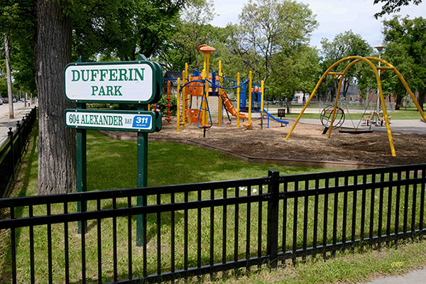 This Winnipeg site is named for Lord Dufferin, Governor-General of Canada from 1872 to 1878, who visited Winnipeg with his wife in 1877. The original Dufferin Park was on the grounds later occupied by Dufferin School though the name “Dufferin Park” was also erroneously used to describe the William Whyte Park, on account of the locomotive Countess of Dufferin on display there.