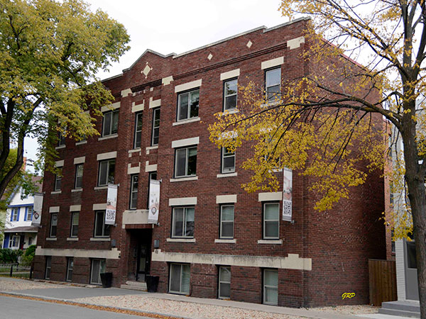This three-storey brick block on Furby Street in Winnipeg was designed by local architect Alexander D. Melville and constructed in 1929 by owner Frederick Niven Davidson at a cost of about $175,000. The 66 foot by 148 foot structure contained 38 apartments in its original configuration. Each was equipped with an electric stove, electric refrigerator, dinette set, and electric fireplace, with monthly rents ranging from $55 to $65. The building contains 39 apartments today.