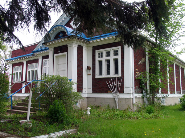 This neat wood-frame Masonic Lodge, constructed in 1921 and expanded in 1948, is centrally located in a residential neighbourhood east of Emerson’s downtown. Situated on a small corner lot, the one-storey building is distinguished by its red and white finishes and a few towering fir trees in its front yard. The site’s municipal designation (1997) applies to the building and its two lots. The building is one of the few remaining intact Freemasonry lodges in Manitoba and a good illustration of the type of facility that served this fraternal organization throughout the province. The classically detailed lodge retains its original character as well as the symbolic furnishings, finishes and regalia used by members of the Ancient Free and Accepted Masons in their rituals and meetings.