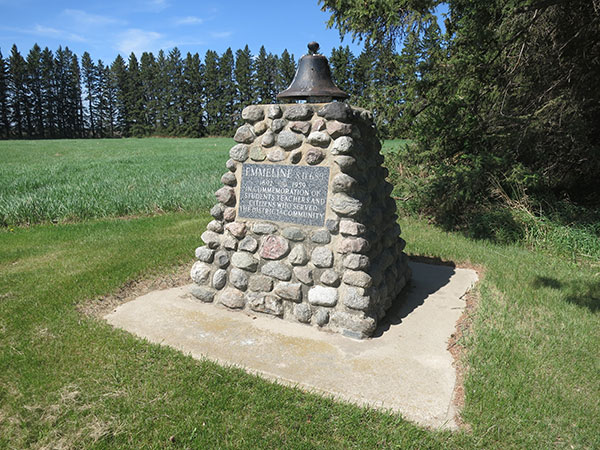The Emmeline School District was established formally in April 1891, in what is now the Municipality of North Norfolk. The school building was constructed on the northeast corner of 23-11-11W, on land sold to the school district for $1 by farmer Thomas Cairns. In 1936, two land parcels immediately adjacent to the school were purchased for $20 and a shelterbelt of fir trees was planted around the entire site. The mature trees are still present. In 1959, the trustees decided to close the school and bus its remaining students to MacGregor School. The school building and site were sold to local residents and, in 1965, the catchment area became part of MacGregor Consolidated School District. A monument built in 1975, topped by the original school bell, commemorates students, teachers, and citizens of the Emmeline area.