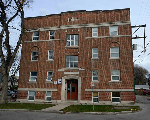 This three-storey brick apartment block on Sara Avenue in Winnipeg was designed and built in 1927 by the Benjaminson Construction Company at a cost of $60,000. The 54 by 117 foot building contained 22 apartments in its original configuration.