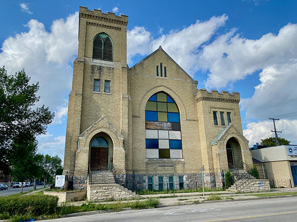 This former Baptist church in Brandon replaced a smaller wood frame structure nearby. Designed in the Gothic Revival style by local architect William A. Elliott, it was constructed of stone and amber brick between 1903 and 1904, with a formal ceremony to lay its cornerstone held on 24 May 1904. The first religious service was held on 4 December 1904. In the early days, graduation ceremonies for the Baptist-affiliated Brandon College were held in the church sanctuary.