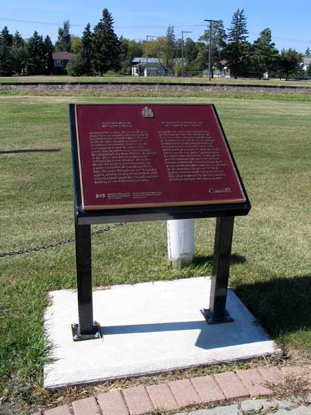 On 3 December 1878, a ceremony was held at this site in Dominion City, in what is now the Municipality of Emerson-Franklin, for the completion of the Pembina Branch of the Canadian Pacific Railway, the first standard-gauge railway in western Canada.