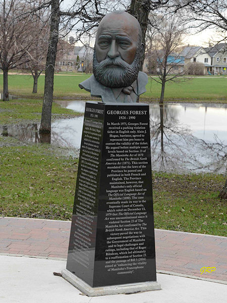 A monument in Provencher Park on Provencher Boulevard in Winnipeg commemorates community activist Georges Forest.