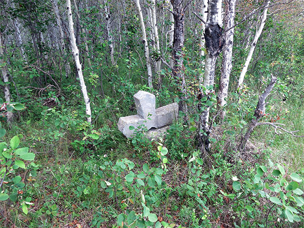 Overgrown grave marker in the Fort Ellice Cemetery (June 2015)