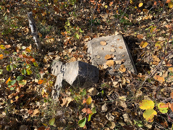 Overgrown grave marker in the Fort Ellice Cemetery (October 2022)