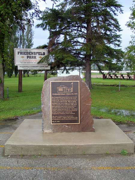 A monument erected on 27 July 2002, at a site about one mile west of the school site (N49.47409, W96.67030), was dedicated to the pioneers, trustees, teachers, and students of the Friedensfeld community.