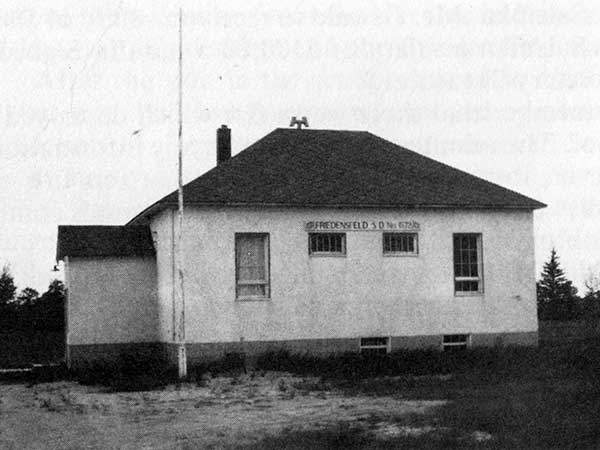The Friedensfeld School District was formed in 1911 and a school was built on the corner of SE13-6-6 east of the Principal Meridian, in the Rural Municipality of Hanover. In 1926, the school was moved to the corner of SE14-6-6E. With an annual enrolment that rose as high as 60 students, the school remained in use until June 1966 when, due to province-wide school consolidation, the school district was incorporated into Hanover School Division No. 15. The school building and 20 acres of land were purchased by local residents and converted into Friesensfeld Community Centre and Park.