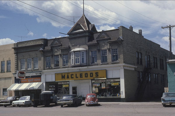 After its time as a department store ended, the building hosted several commercial enterprises, including a recreation centre (1936), poultry processing plant (1936-1937), hardware store (1937-1949) under William Leathley “Bill” Pattinson (1887-1966), and dry goods store (1950). It sat vacant until January 1952, when the first floor became a Macleod’s department store under brothers Valdi Bjarnarson (1915-1980) and Haldor Robert “Dori” Bjarnarson, with the second floor used as residential space.
