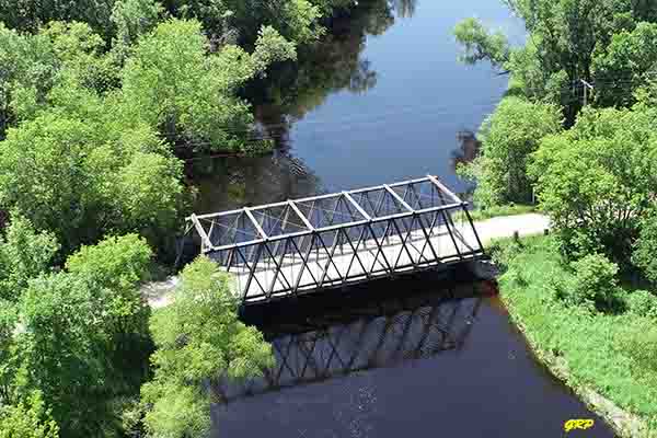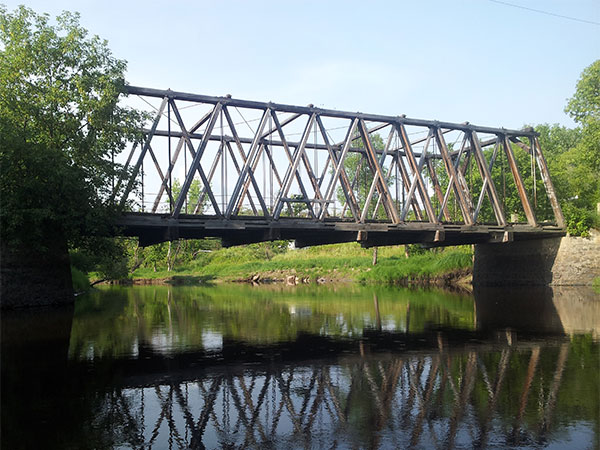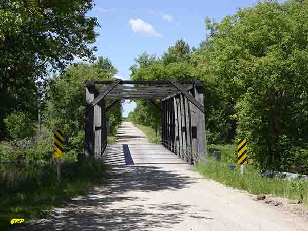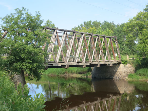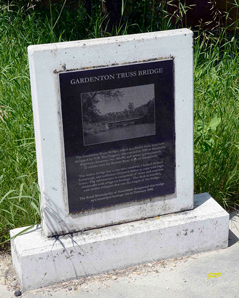 Designed in March 1918 by engineer Neil B. MacTaggart and constructed later that year by contractor M. Kelly at a cost of $6,629, this timber through truss bridge spans 81 feet (25 meters) of the Roseau River east of Gardenton, in the Rural Municipality of Stuartburn. It has a one-lane wood roadway, bolted skeletal wood framework, and a substructure made of stone with concrete abutments. Now a municipally-designated historic site (2002), it was refurbished as part of the Manitoba Prairie Icons project. A commemorative monument stands nearby.