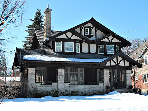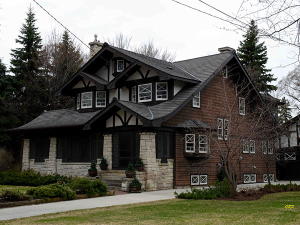 This two-storey house in the Armstrong’s Point area of Winnipeg was built in 1911 for dentist Frank William Glasgow. The Craftsman-style design was adapted by architect Cyril W. U. Chivers from plans that Glasgow brought from California. The home is one of few in the neighbourhood to retains its original large stone verandah, likely because the house is supported by steel I-beams that continue under the floor of the front porch.