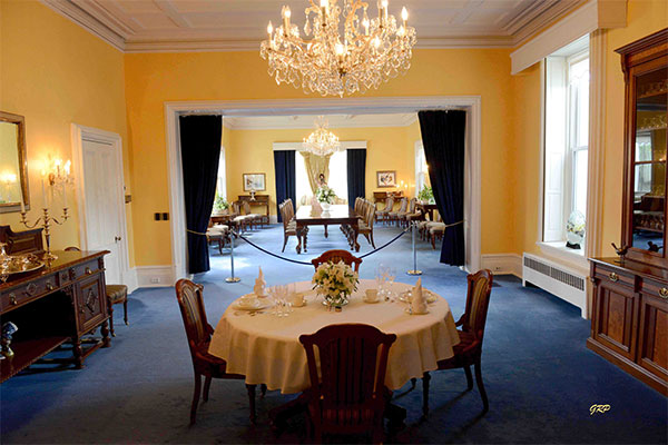 The building has undergone extensive renovations through the years, with additions made in the early years successively replaced by an assembly room on the north side where public receptions are held (1961, designed by provincial architect Basil Roy McPherson) and on the south side a garage and greenhouse (1963). It is one of only three Government Houses across Canada that has been used continuously as a residence since its construction, the other two being in Newfoundland and Prince Edward Island.