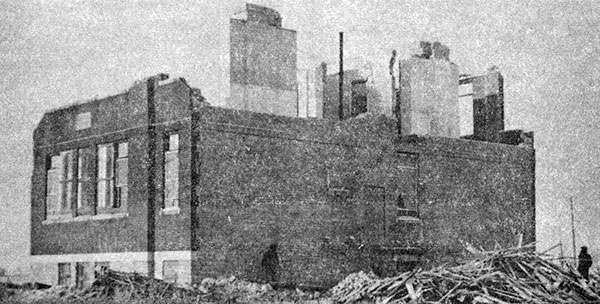 The original Governor Semple School building, constructed in 1913 and demolished in 1943. A bridge in the foregound spanned a ditch on Jefferson Avenue (no date)