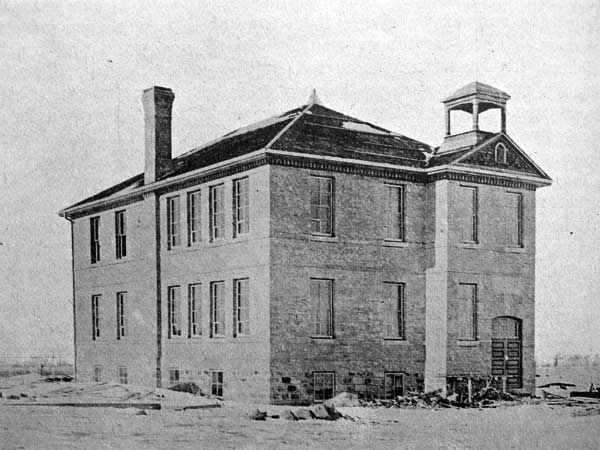 The Grandview School District was established in March 1893 and, in 1906, a two-storey brick schoolhouse designed by Winnipeg architect Frank Robert Evans was built. Initially containing four classrooms, an additional four classrooms were added to the right of its main entrance in 1920.