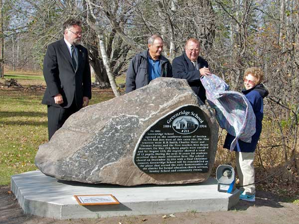 Greenridge School commemorative monument unveiled by (L-R) Ross Metcalfe (Superintendent, Interlake School Division), Terry Hartle (RM of Rockwood), Ralph Eichler (MLA, Lakeside), and Catherine Thexton (October 2011)