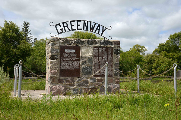This monument in Greenway, in the Rural Municipality of Argyle, commemorates pioneers of the local area, many of whom are listed on it. Named for early Manitoba politician Thomas Greenway, the village was established in 1890 with the arrival in the area of the Canadian Northern Railway. The monument marks the centre of the now-largely-abandoned village.