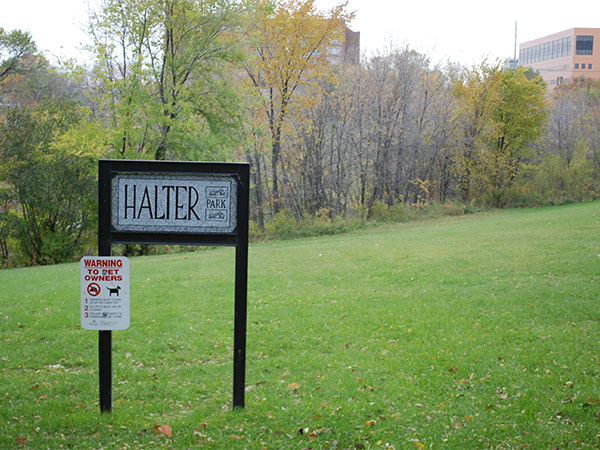 This park in Winnipeg, along both sides of Omand’s Creek west of Raglan Road and otherwise surrounded by Omand Park, was donated by businessman Aubrey Jay Halter in commemoration of his father Maurice Halter.