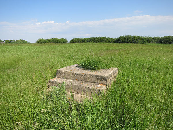 The Haywood School District was organized formally in June 1902 and as of 1944 a two-classroom schoolhouse operated at the southeast corner of SW21-8-6W in the Rural Municipality of Grey. Its district was dissolved in 1964 and the catchment area became part of the Dandurand Consolidated School District and later the Mountain School Division. At the time of a 2015 site visit, only the building’s concrete steps, the outline of its foundation, and a few remnants of the shelterbelt were visible.