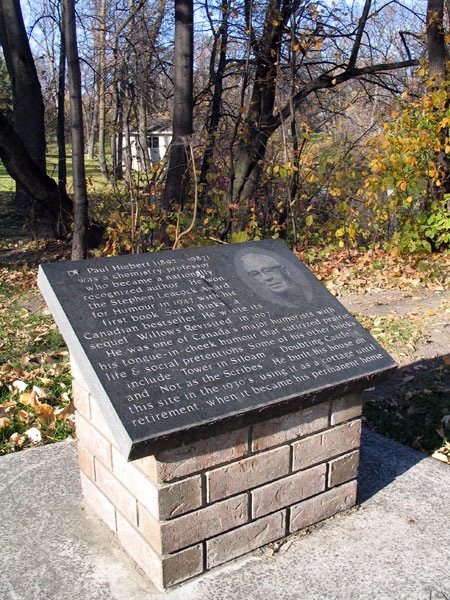 Paul Gerhardt Hiebert was a chemistry professor at the University of Manitoba who became a nationally recognized author and humorist. In the 1930s, he built a house on the site of this monument on Third Street SW in Carman, using it as a cottage until retirement, when it became his permanent home. The building, a municipally-designated heritage site (1991), was later demolished.