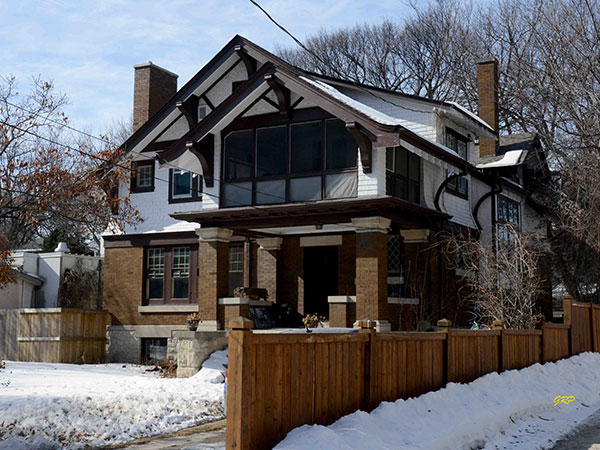 This two-storey brick veneer and stucco residence in the Armstrong’s Point area of Winnipeg was designed by local architect W. W. Blair and built in 1912 for retired building contractor Wilson Hill. An attached sun room was built in 1922.