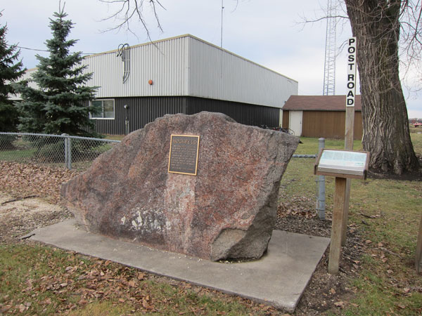 This monument beside Hochfeld School, at Hochfeld in the Municipality of Stanley, commemorates the Mennonite pioneers who settled here in 1875.