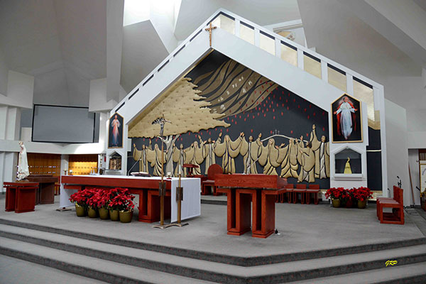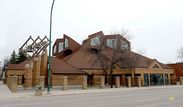 The pulpit and altar of the present church were cutom-built for the 1986 visit to Winnipeg of Pope John Paul II and used in his celebration of a pontifical Mass on this altar in Birds Hill Park. The bells were originally installed on the former church in 1902 and then reinstalled in their new location in 1989. The church contains a replica in miniature of the former Holy Ghost Church. The “relics” from the old church are pews, altars, baptismal font, pulpit, chandelier, six stained-glass windows, and the Stations of the Cross.