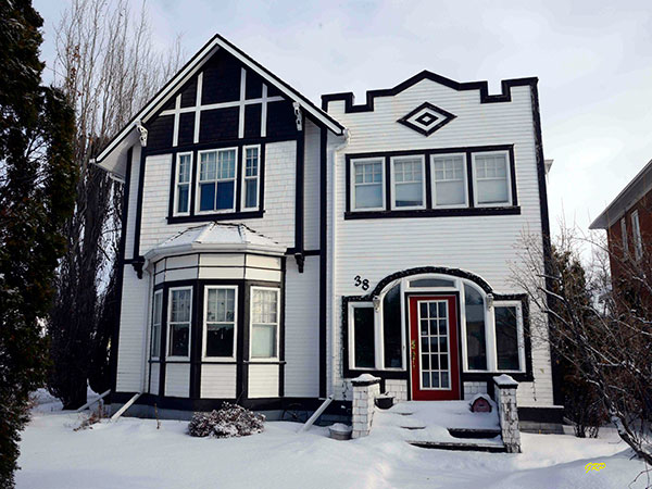 This two-storey wood frame house on Fifth Avenue North West in Dauphin was designed by local architect Herbert John Payton. It was built in 1919 for lumber company manager William John Houston who selected construction materials and supervised their installation. The home contains red fir panels, baseboards, and trim that are meticulously matched. It has maple hardwood floors that have consistent colouring throughout the first and second floor, with the original Asian-themed Art Deco wallpaper on the main floor.