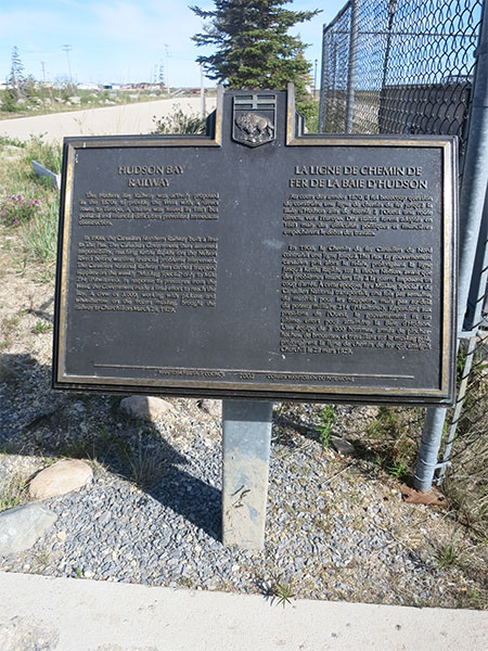 A plaque by the railway station in Churchill was erected in 2002 by the Manitoba Heritage Council to commemorate the Hudson Bay Railway. Conceived and advocated in the 1870s as a direct means to connect western Canada with Europe, a charter for the railway was issued in 1881 but political and financial difficulties prevented its construction. In 1908, the Canadian Northern Railway constructed a line to The Pas. The federal government assumed responsibility for further construction of the line, reaching Kettle Rapids (on the Nelson River) before work was stopped by financial problems arising during the First World War. The Canadian National Railway carried trappers’ supplies on its weekly “Muskeg Special” to Mile 214 (Pikwitonei). During the 1920s, a work crew of some 3,000 men brought the line to Churchill, arriving on 29 March 1929.