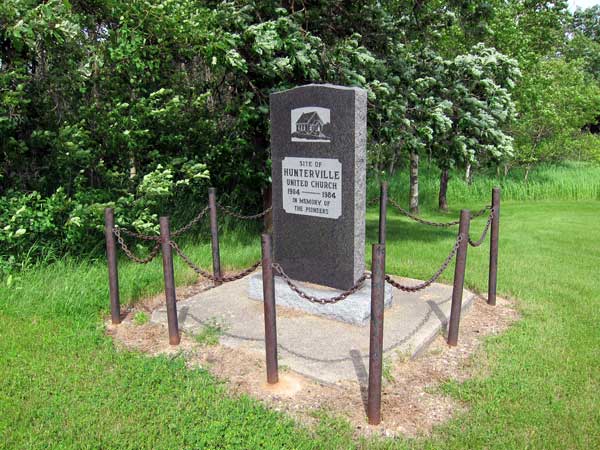 One of two monuments at this site, alongside Highway 10 in the Rural Municipality of Minto-Odanah, marks the former site of the Hunterville United Church. Named Hunterville in recognition of Mrs. W. Hunter, who donated an acre of land on which the church building was erected, its first service was held in October 1904, prior to which they had been held in the former Tremaine School schoolhouse in affiliation with the Presbyterian Church of Rapid City. In 1925, Hunterville became part of the newly formed United Church of Canada. The final service was held on 27 June 1993. Three years later, the former church building was moved to its present location at the Minnedosa and District Museum.