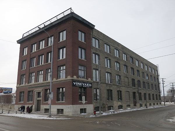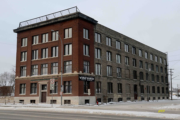 This four-storey brick warehouse building on Main Street in Winnipeg was built in 1904. For many decades, it was the local headquarters of the International Harvester Company, with offices and a showroom on the main floor and storage on the upper levels. The company vacated the building in the mid-1940s, being replaced by the Walter Woods wholesale hardware firm until the early 1980s. It was occupied by several companies until 2002 when the building was purchased by the Winnipeg Centre Vineyard Church. The interior of the first floor was renovated for use as a church with residential apartments on the second and third floors. At the time of a 2017 site visit, the fourth floor was vacant.